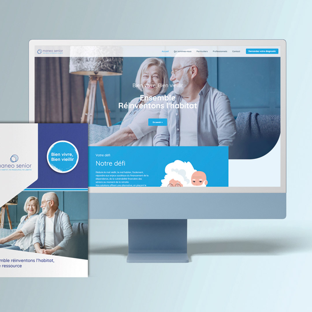 Pour développer sa notoriété, Maneo Senior a entrepris plusieurs initiatives, dont la création d'une identité visuelle distinctive et d'un site internet convaincant. De plus, la société avait besoin de supports imprimés pour présenter ses services lors de rendez-vous.